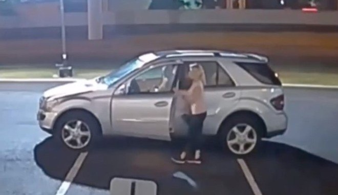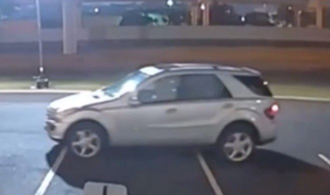 As imagens mostram a mulher chegando ao local em uma SUV prata