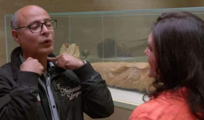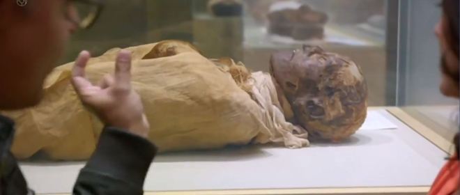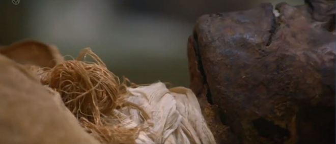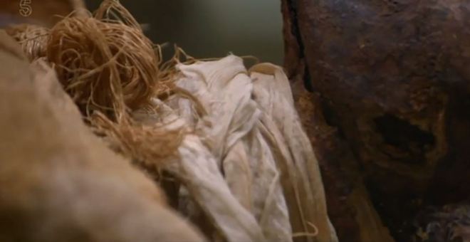 A primeira pista era esse cachecol em volta do pescoço dele, que não poderia ser mexida para não prejudicar o estado da múmia