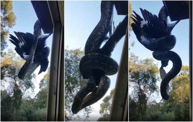 Nas imagens, a cobra, identificada como uma Morelia spilota, aparece de ponta cabeça, estrangulando sua vítima