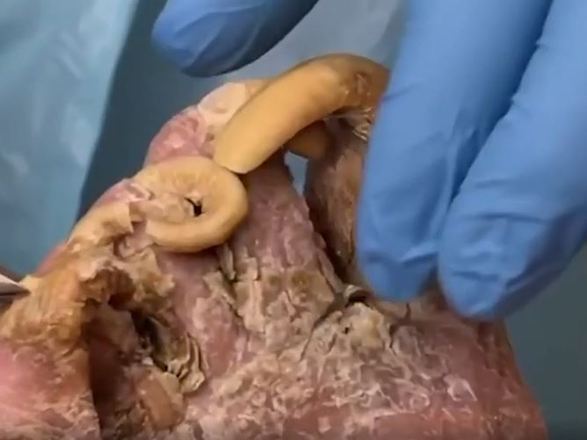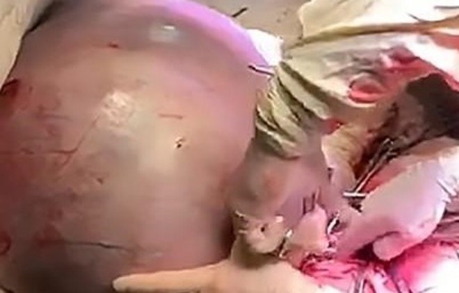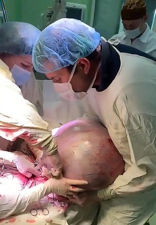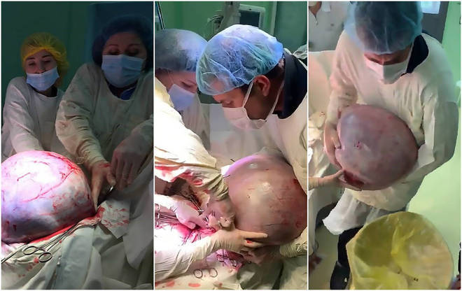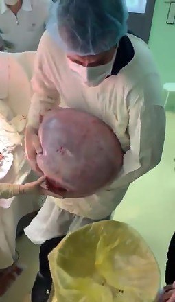 O tamanho do cisto é tão absurdo que o doutor precisa dos dois braços para carregá-lo. No entanto, apesar da força da imagem, a paciente passa bem e já está se recuperando da cirurgia