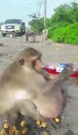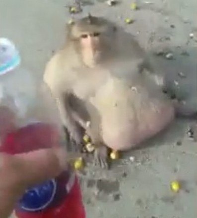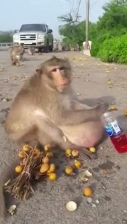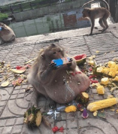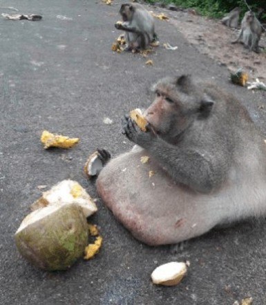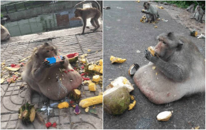 O macaco chegou aos 14 kg após ser constantemente alimentado por turistas. Muitas vezes com comidas calóricas e nada ideais para a dieta do animal