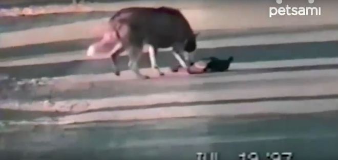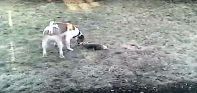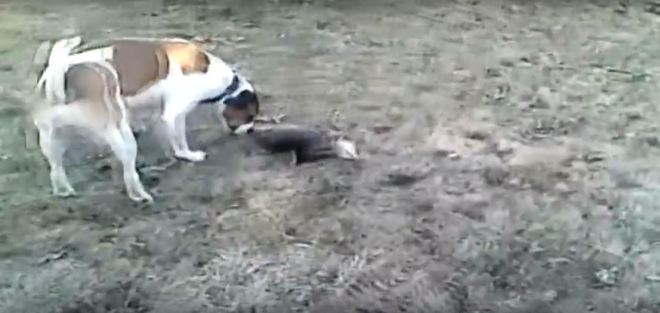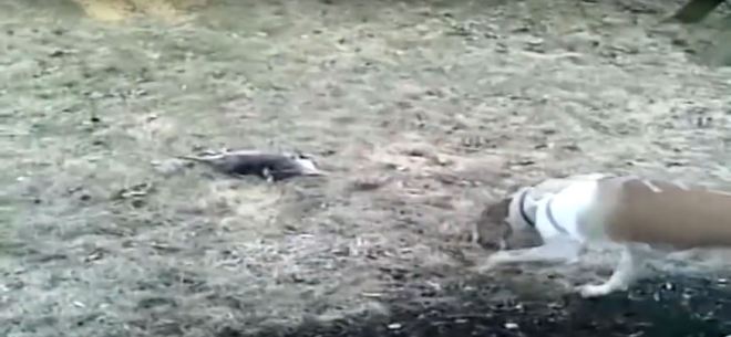 Nesse vídeo, ele aparece estatelado no chão pra não ser devorado por um cachorro