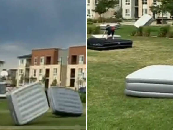Ventos fortíssimos colocaram dezenas de colchões de ar para voar sobre um parque nos arredores de Denver, no Colorado