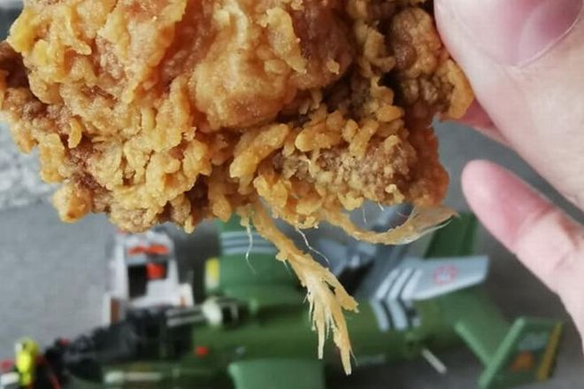 Um porta-voz da KFC disse: "As penas podem acontecer quando se trata de frango fresco - eles são inofensivos, mas é óbvio que eles não deveriam estar lá"