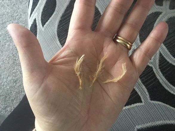 Em uma inspeção mais minuciosa, ela disse que encontrou três "penas grandes" que, aparentemente, foram cobertas e fritas junto com o resto da comida, relata o site Lancs Live