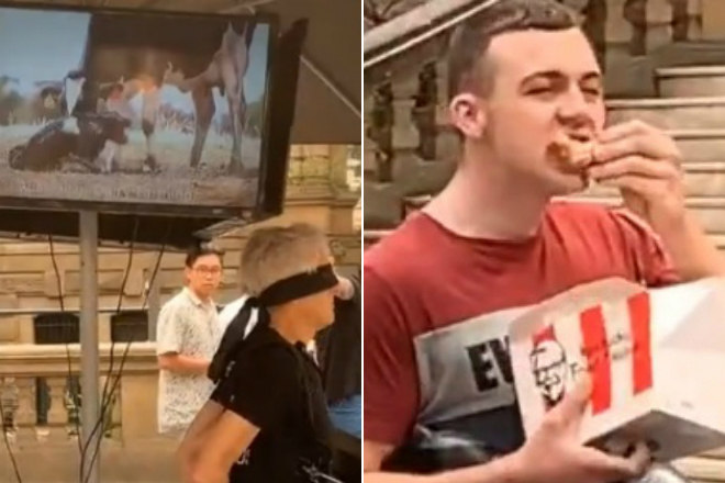Um jovem amante das carnes foi flagrado comendo asinhas de frango durante um protesto vegano do lado de fora da prefeitura de Sydney, na Austrália