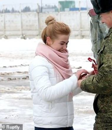 Ele se ajoelha quando a feliz Kopytova, que tem 20 anos, ouve o pedido de casamento