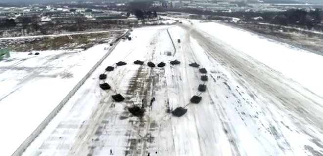 O comandante de pelotão Denis Kazantsev parou os jogos de guerra no Dia dos Namorados e ordenou que os tanques T-72B2 fizessem a forma romântica no campo de treinamento de Alyabino, perto de Moscou