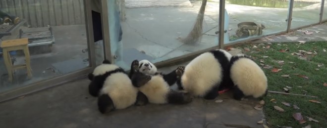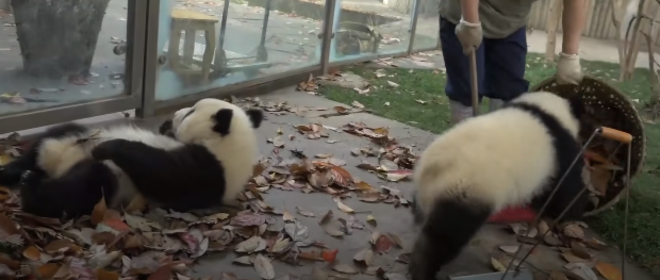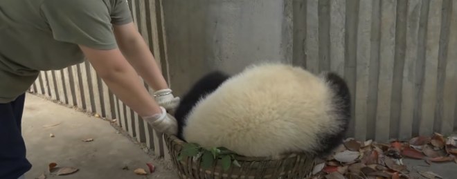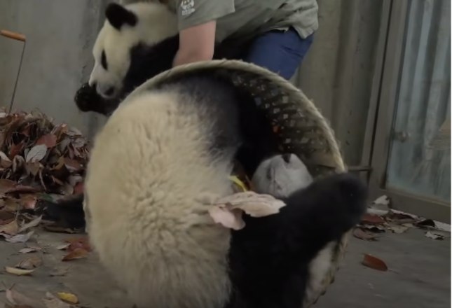 Não deve ser fácil ficar carregando bebês panda de um lado para o outro