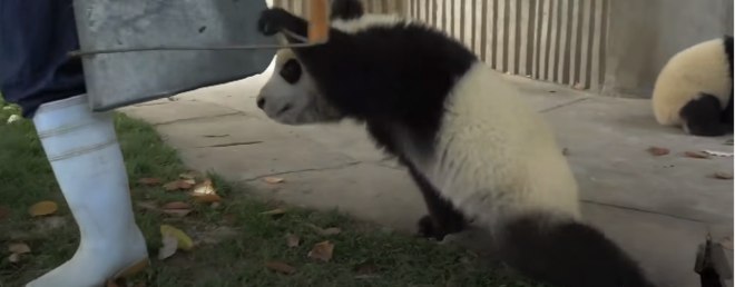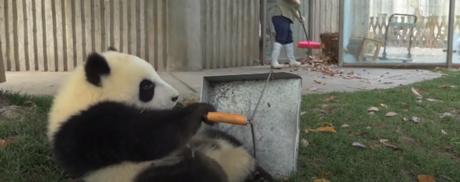 A funcionária da Base de Pesquisa de Criação de Panda Gigante de Chengdu (China), chamada Mei, estava tentando varrer o local
